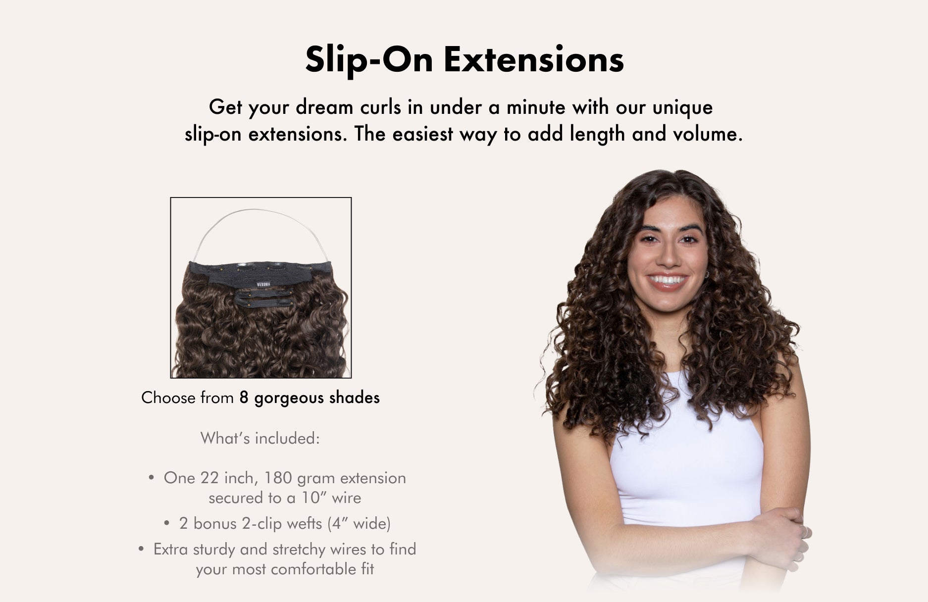 Transform your curls in seconds with Bebonia’s Slip-On curly hair extensions. These discreet and painless extensions amp up your texture - creating volume and length. They’re ideal for those with a 3B curl type, in between a tighter wave and curly texture, with thin to medium thickness, who’s length hits below the bustline.